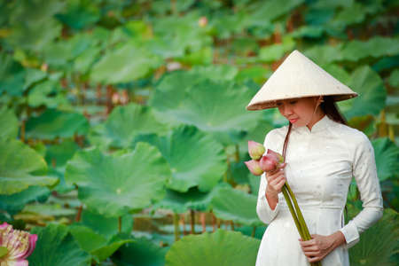 Asian women wear Vietnamese clothes and wear hats. Holding a large bouquet of lotus flowers