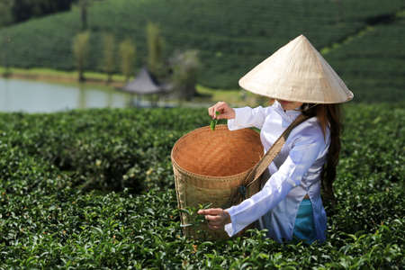 Vietnamese woman in white ao dai or Vietnamese traditional dress with straw hat and basket working in green tea field