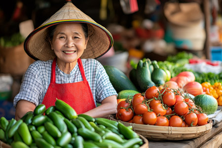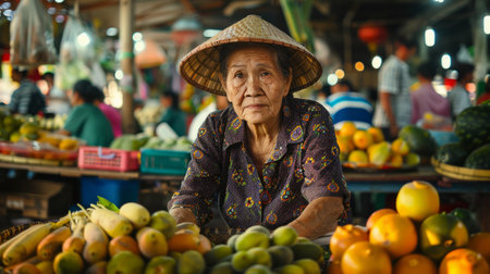 Elderly Asian woman wearing a traditional hat selling vegetables at a street market. Concept of senior vendor, Asian culture, local market, traditional attire.
