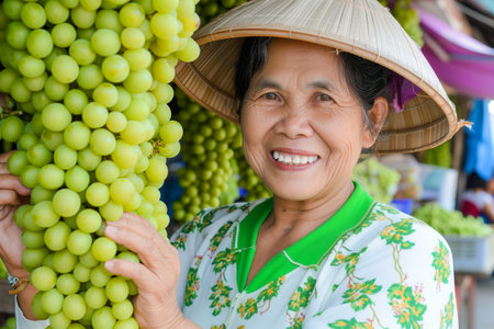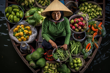Nestled along a serene waterway, a bustling floating market comes to life as local farmers showcase their bountiful harvest. A woman, adorned with a straw hat, cradle a vibrant bundle of fresh greens, her expression reflecting dedication and resilience. Colorful boats filled with fruits and vegetables drift gently, while the lively chatter of vendors and buyers fills the air. This lively environment encapsulates the spirit of community and the age-old tradition of market life on the water.