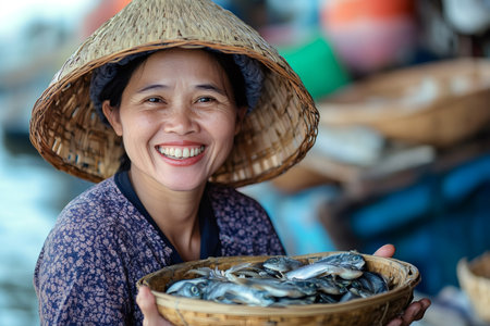 Fishmonger smiling and holding a basket of fresh fish at a traditional market