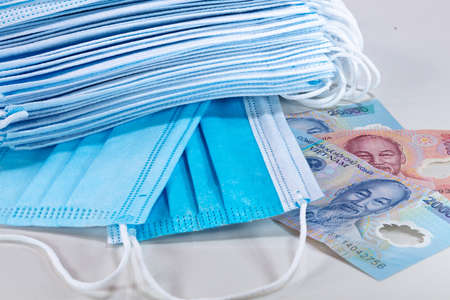 Face masks, the new currency in Vietnam and the world. Corona Cov19 crisis makes mouth mask to most wanted equipment. Prices rising high. Box of face mask with Vietnamese Dong on white background.