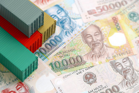 Vietnamese dong currency money bills and toy cargo containers close up. The concept of shipping and logistics