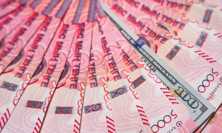 100 dollars among 5000 tenge bills. Paper money from circulation