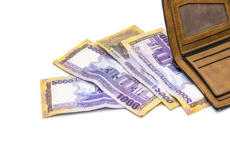 A bunch of scattered one thousand taka bangladesh banknotes with a leather wallet on white background with copy space