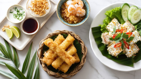 This appetizing arrangement of traditional Asian dishes showcases crispy fried rolls, succulent shrimp, and various flavorful dips, perfect for sharing.