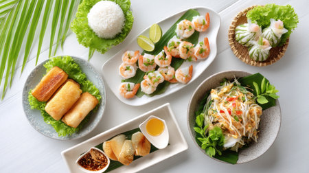 A vibrant assortment of Asian dishes featuring shrimp, rice, fresh herbs, and vegetables beautifully arranged on a white table. Perfect for food photography.
