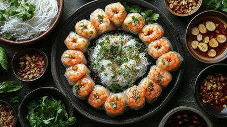 Fresh shrimp spring rolls are arranged around a mound of rice noodles, accompanied by herbs, sauces, and garnishes on a dark table setting.