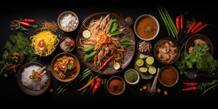 Traditional Thai food on dark background. Oriental food concept. Top view, flat lay, panorama