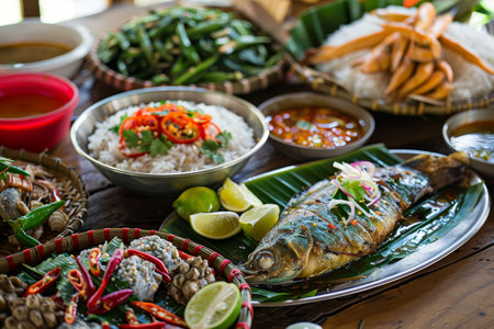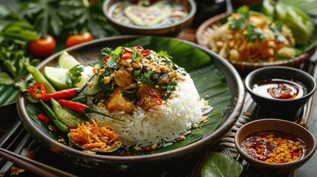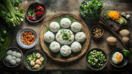 A beautifully arranged Asian meal featuring various rice dishes, fresh vegetables, and herbs, showcasing vibrant colors and delicious flavors for a delightful dining experience.