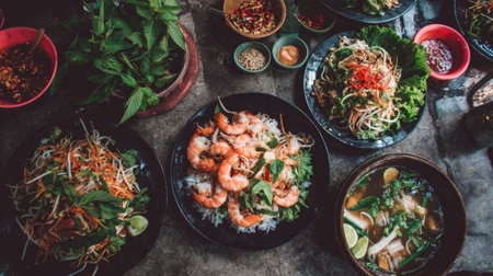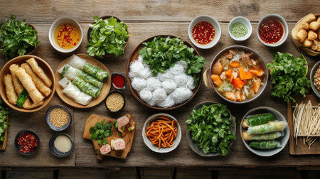A vibrant display of freshly prepared Vietnamese cuisine featuring rice, herbs, and spices, showcasing a perfect medley of traditional flavors and fresh ingredients.