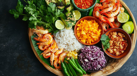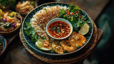 A vibrant platter of Vietnamese cuisine featuring shrimp, herbs, and a spicy dipping sauce. Perfect for showcasing colorful, fresh flavors in food photography.