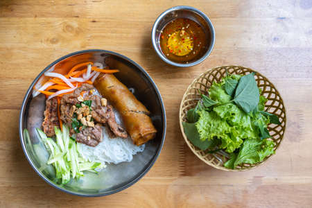 Famous Vietnam food with rice noodles, grill pork and vegetable