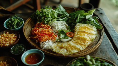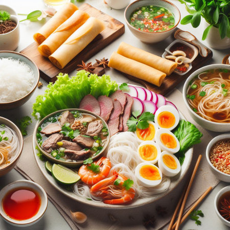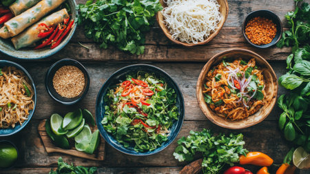 A beautiful arrangement of Vietnamese dish featuring fresh herbs, vibrant vegetables, and rice noodles, perfect for showcasing culinary traditions and healthy eating.