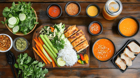 A captivating display of traditional Asian cuisine featuring a variety of fresh vegetables, rice, seafood, and flavorful dipping sauces arranged beautifully on a wooden tray.