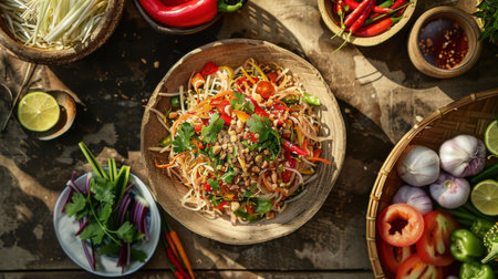 3D rendered top view of a traditional Thai meal with Som Tum Papaya Salad and Grilled Chicken, emphasizing the rich colors and appetizing arrangement with this inviting photo.