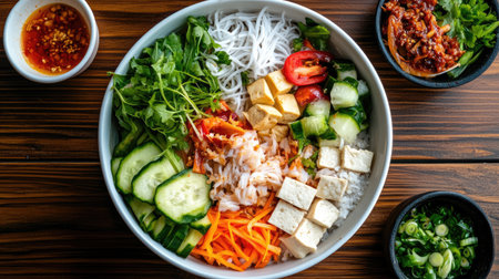 A vibrant Vietnamese rice noodle bowl featuring fresh vegetables, tofu, and herbs. Perfect for a healthy meal option, showcasing colorful ingredients.