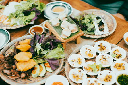 Authentic Hue cuisine dinner set with dumpling, Banh Beo or Bloating Fern-shaped cake dishes on round bamboo mat, tiny, limber rice flour, fried dried shrimp, dipping sauce, herbs, vegetables. Vietnam