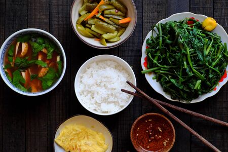 Top view vegan Vietnamese food for lunch, bowl of rice, boiled water spinach, salted cucumber, fried egg, tomato soup, homemade vegetarian meal with vegetables for vegan diet
