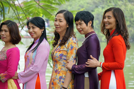 Hanoi, Vietnam - Apr 5, 2015: Group of students in Vietnamese traditional dress Ao Dai taking photo for memory at Ly Thai To park, Dinh Tien Hoang street, by Hoan Kiem lake