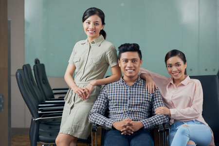 Group of happy friendly young Asian people holding wooden photo frame and posing at camera