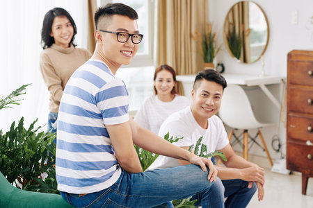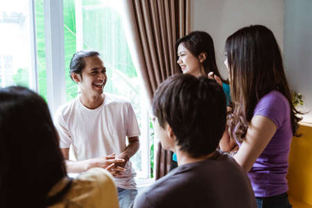 Generative AI : Banner of asian group of friends talking and laughing with happy in gathering meeting sitting at home feeling cheerful and enjoy game in leisure time together Peopl