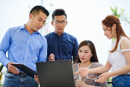 Group of serious young Asian business people gathered at laptop to discuss impact of coronavirus crisis on business