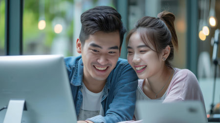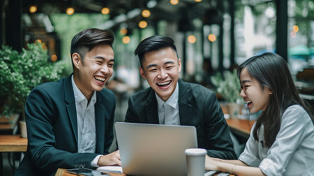 Generative AI : Banner of asian creative team or staff employee feeling enjoy and looking together in meeting room at modern office Brainstorming and planning to achieve goal with