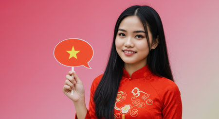 Asian chinese woman in cheongsam holding speech bubble with vietnam flag