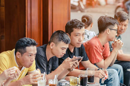 HO CHI MINH CITY, VIETNAM - APRIL 24, 2019 : Unidentified people drink coffee, tea or juice fruit on cafe stall on sidewalk on april 24,2019 in Ho Chi Minh City, Vietnam. Drinking on street is a typical culture of Vietnamese.