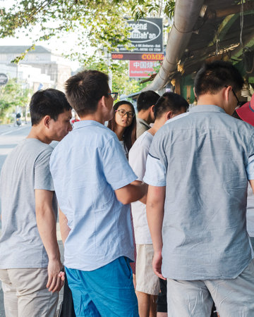 Young asian woman among a group of men on the street. Bali, Jimbaran: 2018-04-27