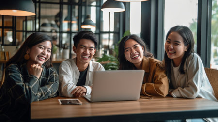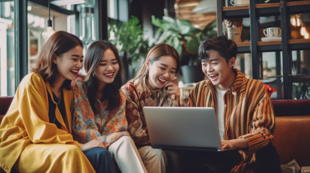 Generative AI : Group of five young asian people watching something with laptop and celebrate together at sofa in home or room Happy and cheerful with friends in casual style Funny