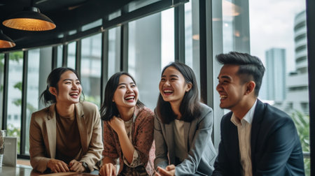 Generative AI : Group of asia people smile relax study enjoy learn workshop training class in good break time fun talk work at modern cowork office MBA startup team woman engage jo
