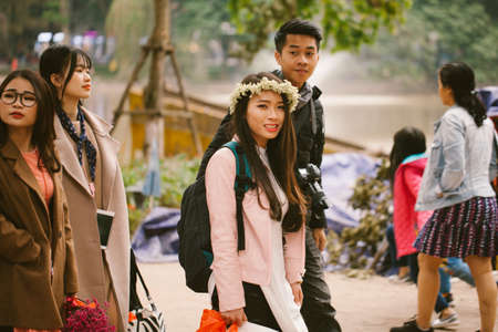 Vietnam. Hanoi. January 13, 2018. A beautiful young girl stands out and walks in the center in a crowd of friends