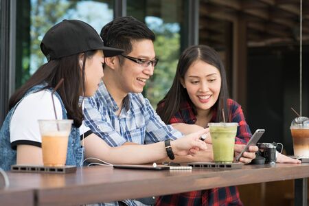 Three young Asian friends smiling while using electronic devices connected to the wireless internet network of a modern coffee shop