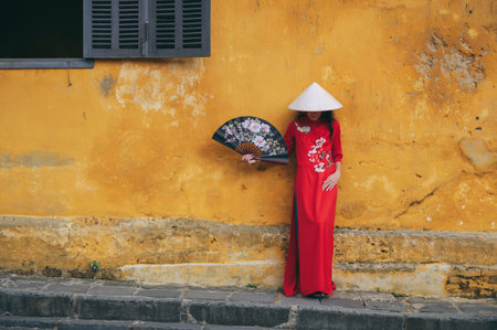 Asian young woman traveler tourist in traditional vietnamese non la hat and red dress with a fan on an old town street in Hoi An in Vietnam in Asia