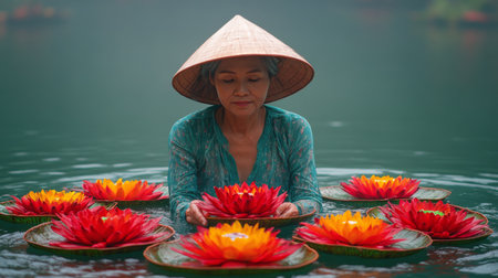 A woman wearing traditional attire sits peacefully in the calm waters of a lush landscape, with vibrant yellow flowers floating around her.