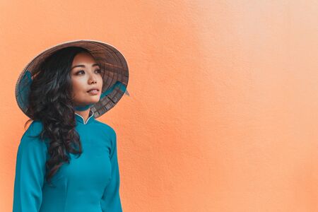 Close up portrait of pretty asian girl dressed in Ao Dai dress with vietnamese conical hat against arches background.