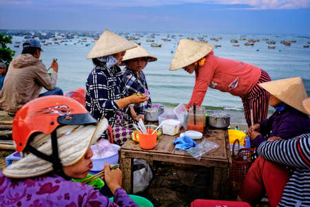 Local vendor is collecting fishes and shelles at famous fishing village in Mui ne, Vietnam