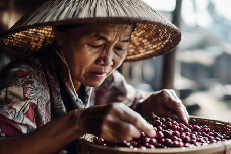 Close-up of a woman in a conical hat, meticulously selecting coffee berries.
