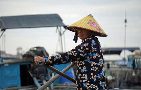 Can Tho, Vietnam, circa Februara 2020: Vendors life on the can tho floating market