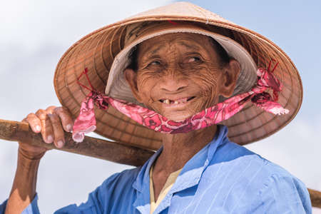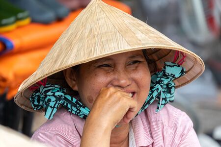 Hoi An, Vietnam - October 28, 2018: a smiling elderly Vietnamese lady, a street vendor, poses in a conical hat.