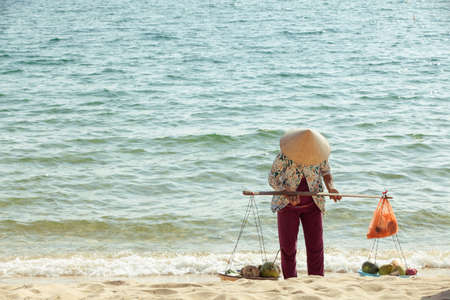 PHAN THIET, VIETNAM - Feb 16, 2015: Vietnamese Girl vietnam hat Slow life. People tropical beach with coconut palm trees, Phan Thiet. Travel Southeast Asia Coast Binh Thuan of Vietnam.