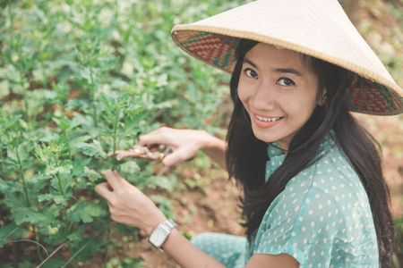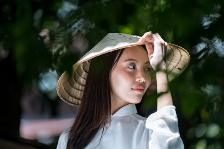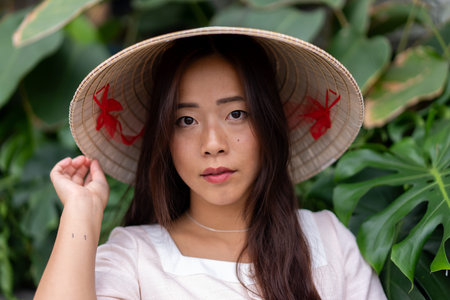 Portrait of vietnamese woman wearing traditional conical hat, standing in front of green plants. High quality photo