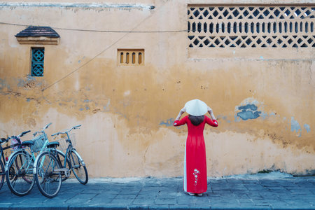 happy woman wearing Ao Dai Vietnamese dress and hat, traveler sightseeing at Hoi An ancient town in central Vietnam. landmark and popular for tourist attractions. Vietnam and Southeast travel concept