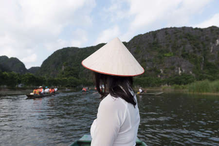 Vietnamese woman wearing purple long arm t-shirt conical hat siting and waiting on the land for tourist at Trang An Grottoes in Ninh Binh, Vietnam.