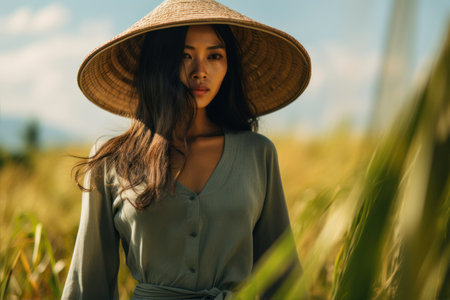 Portrait of a beautiful Asian woman wearing straw hat in rice field