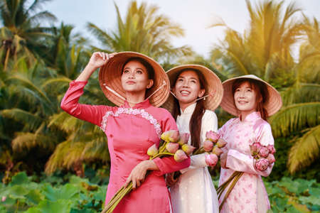 Portrait of Vietnam girls with Ao Dai, Vietnam traditional dress, Ao Dai is famous traditional costume for woman in Vietnam.