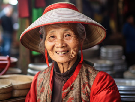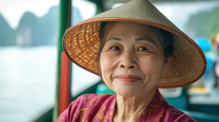 Senior Vietnamese woman wearing a traditional conical hat smiling looking away