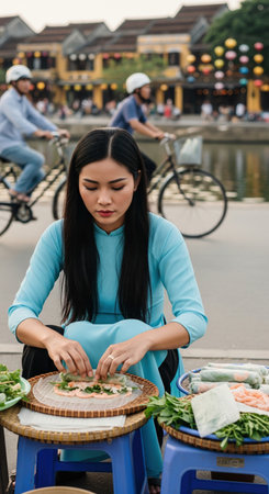 Vietnamese woman in traditional ao dai dress making fresh spring rolls on street. A scene of authentic local Asian street food culture.